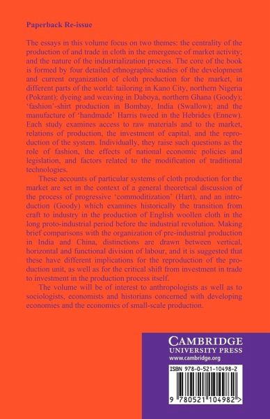 The essays in this volume focus on two themes: the centrality of the production of and trade in cloth in the emergence of market activity; and the nature of the industrialization process. The core of the book is formed by four detailed ethnographic studies of the development and current organization of cloth production for the market, in different parts of the world: tailoring in Kano City, northern Nigeria (Pokrant); dyeing and weaving in Daboya, northern Ghana (Goody); 'fashion'- shirt production in Bombay, India (Swallow); and the manufacture of 'handmade' Harris tweed in the Hebrides (Ennew). Each study examines access to raw materials and to the market, relations of production, the investment of capital and the reproduction of the system. Individually, they raise such questions as the role of fashion, the effects of national economic policies and legislation, and factors related to the modification of traditional technologies.