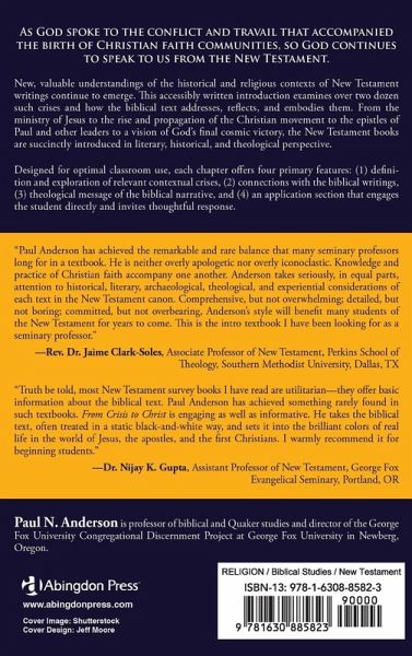 Scholars continue to unearth valuable understandings of the historical and religious worlds out of which the New Testament writings emerged. This beautifully-crafted introduction notes more than two dozen contextual crises and how the biblical text addresses and reflects them. From the ministry of Jesus, to the rise and progress of the Christian movement, to the epistles of Paul and other leaders, to a vision of God's final cosmic victory, the New Testament books are succinctly introduced in literary, historical, and theological perspectives. Designed for optimal use in a 14- or a 10-week undergraduate or graduate course, each chapter is designed with four primary features in mind: (a) contextual crises shedding light on the subject; (b) connections with the biblical writings being discussed in that chapter; (c) primary features of the book(s) being discussed; and (d) an application section dealing with the relevance of the biblical content then and now. Anderson also uses call-out boxes and shorter vignettes to heighten particular themes, while images, charts, and maps are used to make information accessible for students.