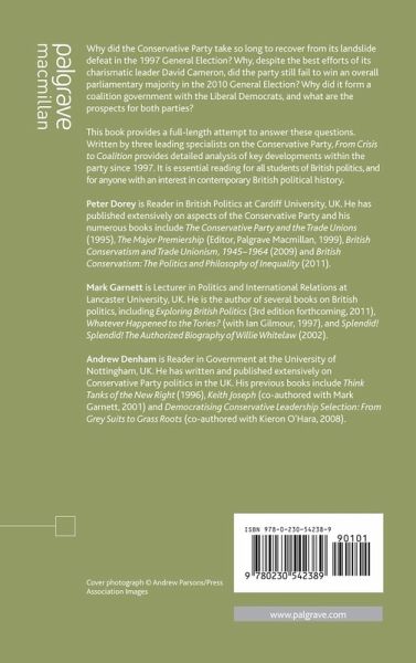 PETER DOREY is Reader in British Politics at Cardiff University, UK. He has published extensively on aspects of the Conservative Party and his twelve books include The Conservative Party and the Trade Unions (1995), The Major Premiership (Editor, Palgrave Macmillan, 1999), British Conservatism and Trade Unionism, 1945-1964 (2009) and British Conservatism: The Politics and Philosophy of Inequality (2011). MARK GARNETT is Lecturer in Politics and International Relations at Lancaster University, UK. He is the author of several books on British Politics, including Exploring British Politics (3rd edition forthcoming, 2011), Whatever Happened to the Tories? (with Ian Gilmour, 1997), and Splendid! Splendid! The Authorized Biography of Willie Whitelaw (2002). ANDREW DENHAM is Reader in Government at the University of Nottingham, UK. He has written and published extensively on Conservative Party politics in the UK. His previous books include Think Tanks of the New Right (1996), Keith Joseph (co-authored with Mark Garnett, 2001) and Democratising Conservative Leadership Selection: From Grey Suits to Grass Roots (co-authored with Kieron O'Hara, 2008).