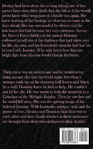 Destiny had been alone for so long taking care of her parent farm since their death that she felt as if she would never know what being part of a family was again. She knew nothing of her heritage or what was to come in the days ahead. She was surrounded by silence and the loneliness that had become her very existence. Across the Sacred Forest hidden in his manor Dominic wallowed in self pity at the darkness that had taken over his life, his soul, and his household when he had lost his beloved wife Jasmine. If he only knew how that one bright light from his past would change his future. Their curse was an ancient one and he would never bring anyone else into his world again, but when a stranger ends up on his doorstep half frozen and bitten by a wolf, Dominic knew he had to help. He couldn't just let her die. He was sworn to help the innocent as a Guardian of the Mahigan Knights. Then he saw her and his world fell away. She was the spitting image of his beloved Jasmine. With heartache, intrigue, trial, and the power of love, Destiny and Dominic find their way to each other and their family watches as these soulmates are brought from their own darkness to their destiny.