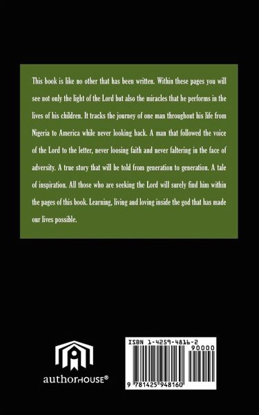 This book is like no other that has been written. Within these pages you will see not only the light of the Lord but also the miracles that he performs in the lives of his children. It tracks the journey of one man throughout his life from Nigeria to America while never looking back. A man that followed the voice of the Lord to the letter, never loosing faith and never faltering in the face of adversity. A true story that will be told from generation to generation. A tale of inspiration. All those who are seeking the Lord will surely find him within the pages of this book. Learning, living and loving inside the god that has made our lives possible.