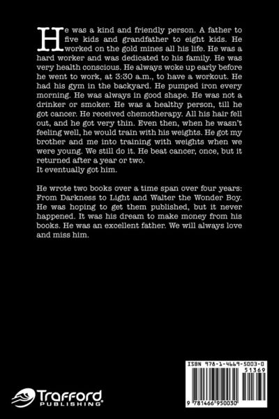 He was a kind and friendly person. A father to five kids and grandfather to eight kids. He worked on the gold mines all his life. He was a hard worker and was dedicated to his family. He was very health conscious. He always woke up early before he went to work, at 3:30 a.m., to have a workout. He had his gym in the backyard. He pumped iron every morning. He was always in good shape. He was not a drinker or smoker. He was a healthy person, till he got cancer. He received chemotherapy. All his hair fell out, and he got very thin. Even then, when he wasn't feeling well, he would train with his weights. He got my brother and me into training with weights when we were young. We still do it. He beat cancer, once, but it returned after a year or two. It eventually got him. He wrote two books over a time span over four years: From Darkness to Light and Walter the Wonder Boy. He was hoping to get them published, but it never happened. It was his dream to make money from his books. He was an excellent father. We will always love and miss him.