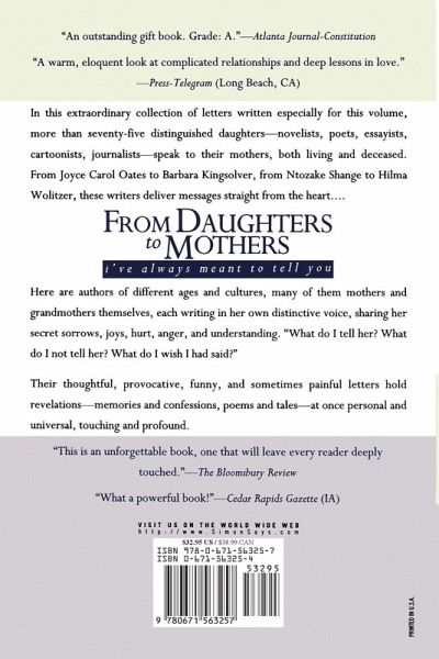 In this extraordinary collection of original letters, poems, essays, cartoons, and stories, more than 75 contemporary women authors speak to their mothers--both living and deceased--with messages that come straight from the heart.