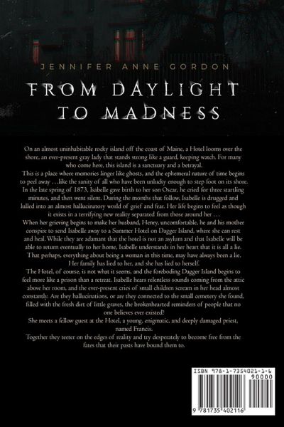The latest book from the critically acclaimed author of Beautiful, Frightening, and Silent; Jennifer Anne Gordon. On an almost uninhabitable rocky island off the coast of Maine, a Hotel looms over the shore, an ever-present gray lady that stands strong like a guard, keeping watch. For many who come here, this island is a sanctuary and a betrayal. This is a place where memories linger like ghosts, and the ephemeral nature of time begins to peel away ...like the sanity of all who have been unlucky enough to step foot on its shore. In the late spring of 1873, Isabelle gave birth to her son Oscar, he cried for three startling minutes, and then went silent. During the months that follow, Isabelle is drugged and lulled into an almost hallucinatory world of grief and fear. Her life begins to feel as though it exists in a terrifying new reality separated from those around her ... When her grieving begins to make her husband, Henry, uncomfortable, he and his mother conspire to send Isabelle away to a Summer Hotel on Dagger Island, where she can rest and heal. While they are adamant that the hotel is not an asylum and that Isabelle will be able to return eventually to her home, Isabelle understands in her heart that it is all a lie. That perhaps, everything about being a woman in this time, may have always been a lie. Her family has lied to her, and she has lied to herself. The Hotel, of course, is not what it seems, and the foreboding Dagger Island begins to feel more like a prison than a retreat. Isabelle hears relentless sounds coming from the attic above her room, and the ever-present cries of small children scream in her head almost constantly. Are they hallucinations, or are they connected to the small cemetery she found, filled with the fresh dirt of little graves, the brokenhearted reminders of people that no one believes ever existed? She meets a fellow guest at the Hotel, a young, enigmatic, and deeply damaged priest, named Francis. Together they teeter on the edges of reality and try desperately to become free from the fates that their pasts have bound them to. From Daylight to Madness is a poetic, and haunting Gothic Fiction novel that is both profoundly unsettling and darkly romantic.