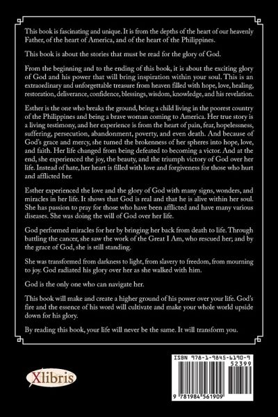 This book is fascinating and unique. It is from the depths of the heart of our heavenly Father, of the heart of America, and of the heart of the Philippines. This book is about the stories that must be read for the glory of God. From the beginning and to the ending of this book, it is about the exciting glory of God and his power that will bring inspiration within your soul. This is an extraordinary and unforgettable treasure from heaven filled with hope, love, healing, restoration, deliverance, confidence, blessings, wisdom, knowledge, and his revelation. Esther is the one who breaks the ground, being a child living in the poorest country of the Philippines and being a brave woman coming to America. Her true story is a living testimony, and her experience is from the heart of pain, fear, hopelessness, suffering, persecution, abandonment, poverty, and even death. And because of God's grace and mercy, she turned the brokenness of her spheres into hope, love, and faith. Her life changed from being defeated to becoming a victor. And at the end, she experienced the joy, the beauty, and the triumph victory of God over her life. Instead of hate, her heart is filled with love and forgiveness for those who hurt and afflicted her. Esther experienced the love and the glory of God with many signs, wonders, and miracles in her life. It shows that God is real and that he is alive within her soul. She has passion to pray for those who have been afflicted and have many various diseases. She was doing the will of God over her life. God performed miracles for her by bringing her back from death to life. Through battling the cancer, she saw the work of the Great I Am, who rescued her; and by the grace of God, she is still standing. She was transformed from darkness to light, from slavery to freedom, from mourning to joy. God radiated his glory over her as she walked with him. God is the only one who can navigate her. This book will make and create a higher ground of his power over your life. God's fire and the essence of his word will cultivate and make your whole world upside down for his glory. By reading this book, your life will never be the same. It will transform you.