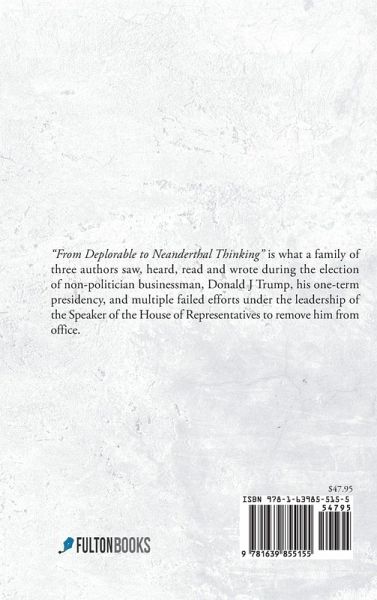From Deplorable to Neanderthal Thinking is what a family of three authors saw, heard, read, and wrote during the election of nonpolitician businessman, Donald J Trump, his one-term presidency, and multiple failed efforts under the leadership of the Speaker of the House of Representatives to remove him from office.