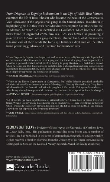 From Disgrace to Dignity: Redemption in the Life of Willie Rico Johnson examines the life of Rico Johnson who became the head of the Conservative Vice Lords, one of the largest street gangs in the United States. In addition to highlighting his life, this work considers how redemption has affected his life. In addition, Minister Rico is identified as a Godfather. Much like the Godfathers found in organized crime families, Rico sees himself as providing a positive force to Vice Lords' gang members. On one hand, what this involves is taking care of their needs (he feeds 150 families a day) and, on the other hand, providing guidance and direction for members' lives.