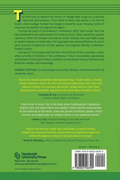 Listen as you read! From Dixie to Rocky Top: Book Playlist, now on Spotify. The first book to explore the history of college fight songs as a culturally important phenomenon, From Dixie to Rocky Top zeroes in on the US South, where college football has forged a powerful, quasi-religious sense of meaning and identity throughout the region. Tracing the story of Southeastern Conference (SEC) fight songs from the late nineteenth to the early twenty-first century, author Carrie Tipton places this popular repertory within the broader commercial music industry and uses fight songs to explore themes of authorship and copyright; the commodification of school spirit; and the construction of race, gender, and regional identity in Southern football culture. This book unearths the history embedded in SEC football's music traditions, drawing from the archives of the seventeen universities currently or formerly in the conference. Alongside rich primary sources, Tipton incorporates approaches and literature from sports history, Southern and American history, Southern and American studies, and musicology. Chronicling iconic Southern fight songs' origins, dissemination, meanings, and cultural reception over a turbulent century, From Dixie to Rocky Top weaves a compelling narrative around a virtually unstudied body of popular music.