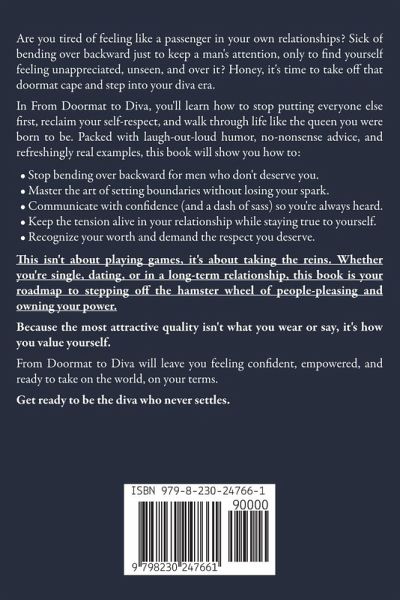 Are you tired of feeling like a passenger in your own relationships? Sick of bending over backward just to keep a man's attention, only to find yourself feeling unappreciated, unseen, and over it? Honey, it's time to take off that doormat cape and step into your diva era. In From Doormat to Diva, you'll learn how to stop putting everyone else first, reclaim your self-respect, and walk through life like the queen you were born to be. Packed with laugh-out-loud humor, no-nonsense advice, and refreshingly real examples, this book will show you how to:Stop bending over backward for men who don't deserve you. Master the art of setting boundaries without losing your spark. Communicate with confidence (and a dash of sass) so you're always heard. Keep the tension alive in your relationship while staying true to yourself. Recognize your worth and demand the respect you deserve. This isn't about playing games, it's about taking the reins. Whether you're single, dating, or in a long-term relationship, this book is your roadmap to stepping off the hamster wheel of people-pleasing and owning your power. Because the most attractive quality isn't what you wear or say, it's how you value yourself. From Doormat to Diva will leave you feeling confident, empowered, and ready to take on the world, on your terms. Get ready to be the diva who never settles.