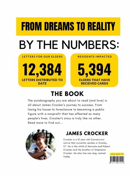 The Extraordinary Journey of James Crocker; From Dreams To Reality is all about James Crocker the 15 year old Connecticut Native who at just 7 years old invented a revolutionary product to make schools safer and at just 13 founded a nonprofit named Letters for our Elders which is devoted to reducing loneliness in Senior Homes through sending letters of hope, joy, and congratulations to residents of said senior homes. Crocker's story is one like no other. And his tell-all autobiography is a must-read! It offers insight into his thought process, and how he has accomplished so much at just 15. This autobiography is rated E for everyone. Ages 6+