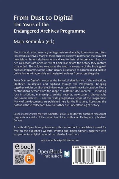 Much of world's documentary heritage rests in vulnerable, little-known and often inaccessible archives. Many of these archives preserve information that may cast new light on historical phenomena and lead to their reinterpretation. But these rich collections are often at risk of being lost before the history they capture is recorded. This volume celebrates the tenth anniversary of the Endangered Archives Programme at the British Library, established to document and publish online neglected and formerly inaccessible archives from across the globe. From Dust to Digital showcases the historical significance of the collections identified, catalogued and digitised through the Programme, bringing together articles on 19 of the 244 projects supported since its inception. These contributions demonstrate the range of materials documented - including rock inscriptions, manuscripts, archival records, newspapers, photographs and sound archives - and the wide geographical scope of the Programme. Many of the documents are published here for the first time, illustrating the potential these collections have to further our understanding of history.