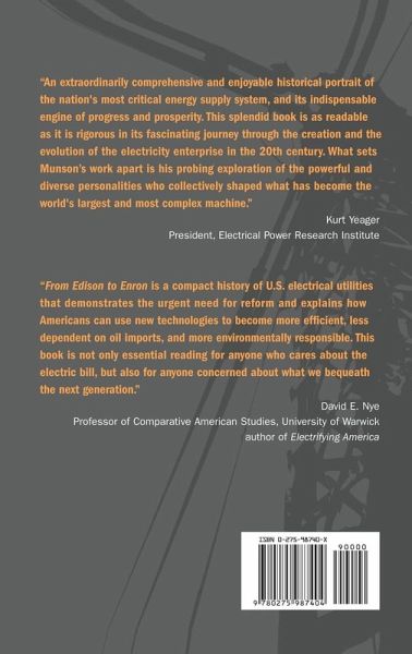 The blackout of 2003 illuminated just how dependent America is on electricity. It was not just that some 50 million people in eight states and Ontario were cut off from their televisions, microwaves, ATMs, and email. Without the electrical juice to keep their sockets alive, factory managers were forced to close production lines, city managers shut down water deliveries, grocery store clerks watched their frozen inventory slowly melt away. Economists estimated that the blackout cost Americans $5 billion even as energy analysts were predicting that a similar blackout could happen again. The catastrophe forced us to marvel at the unusual ability of sub-microscopic particles to move like waves inside a wire and cause bulbs to glow. It highlighted the complex requirements for managing the massive generators, transformers, transmission lines, and switch boxes needed to tap and deliver flowing electrons. It encouraged us to recognize the profound impact of electricity on all aspects of commerce and culture. Such events as the blackout, the Enron debacle, and the California brownouts also reveal the cracks in a 100-year-old industry structure that have been building ever since Thomas Edison, George Westinghouse, and their contemporaries first managed to harness electricity and make it available to the masses, and tycoons, such as Sam Insull and George Norris, began to concentrate financial control and political influence. From Edison to Enron traces the controversial history of this $210 billion industry-the nation's largest-showcasing the key individuals, technological innovations, corporate machinations, and political battles that have been waged over its domination. Munson maintains that today's technological and regulatory infrastructure, as a function of its history, is a relic that has long outlived its usefulness; he points out that two-thirds of the fuel burned to generate electricity is lost, that Americans pay roughly $100 billion too much each year for heat and power, and that environmentally unfriendly generators are the nation's largest polluters. Meanwhile, innovations in technology and business models are being blocked by entrenched monopolies. Ultimately, Munson argues that current policies and practices, including those favored by the Bush Administration, are preventing entrepreneurs from producing more efficient, healthy, and sustainable power supplies. Moreover, he presents an agenda for business and policy reforms that will stimulate economic development in the United States and around the world.