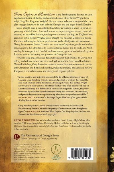 From Empire to Revolution is the first biography devoted to an in-depth examination of the life and conflicted career of Sir James Wright (1716-1785). Greg Brooking uses Wright's life as a means to better understand the complex struggle for power in both colonial Georgia and the larger British Empire. James Wright lived a transatlantic life, taking advantage of every imperial opportunity afforded him. He earned numerous important government posts and amassed an incredible fortune, totaling over £100,000 sterling. An England-born grandson of Sir Robert Wright, James Wright was raised in Charleston, South Carolina, following his father's appointment as the chief justice of that colony. Young James served South Carolina in a number of capacities, public and ecclesiastical, prior to his admittance to London's famed Gray's Inn to study law. Most notably, he was appointed South Carolina's attorney general and colonial agent to London prior to becoming the governor of Georgia in 1761. Wright's long imperial career delicately balanced dual loyalties to Crown and colony and offers a new perspective on loyalism and the American Revolution. Through this lens, Greg Brooking connects several important contexts in recent early American and British scholarship, including imperial and Atlantic history, Indigenous borderlands, race and slavery, and popular politics.