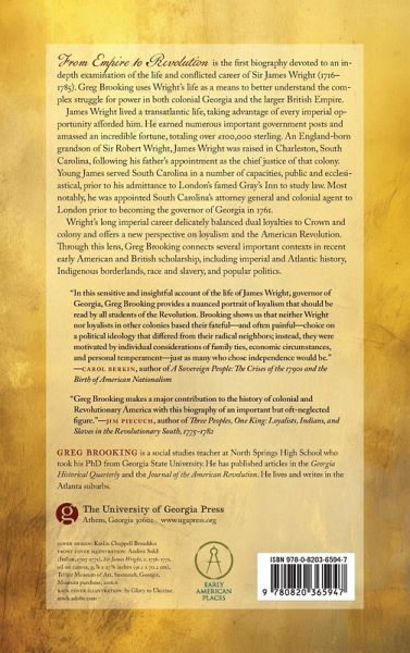 From Empire to Revolution is the first biography devoted to an in-depth examination of the life and conflicted career of Sir James Wright (1716-1785). Greg Brooking uses Wright's life as a means to better understand the complex struggle for power in both colonial Georgia and the larger British Empire. James Wright lived a transatlantic life, taking advantage of every imperial opportunity afforded him. He earned numerous important government posts and amassed an incredible fortune, totaling over £100,000 sterling. An England-born grandson of Sir Robert Wright, James Wright was raised in Charleston, South Carolina, following his father's appointment as the chief justice of that colony. Young James served South Carolina in a number of capacities, public and ecclesiastical, prior to his admittance to London's famed Gray's Inn to study law. Most notably, he was appointed South Carolina's attorney general and colonial agent to London prior to becoming the governor of Georgia in 1761. Wright's long imperial career delicately balanced dual loyalties to Crown and colony and offers a new perspective on loyalism and the American Revolution. Through this lens, Greg Brooking connects several important contexts in recent early American and British scholarship, including imperial and Atlantic history, Indigenous borderlands, race and slavery, and popular politics.