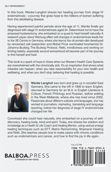 In this book, Wenke Langhof shares her healing journey from stage IV endometriosis - a journey that gives hope to the millions of women suffering from this debilitating disease. Having experienced painful periods since the age of 11, Wenke finally got diagnosed with stage IV endometriosis aged 34. Determined not to have the proposed hysterectomy, she embarked on a quest to heal herself naturally. A research paper about Warburg effect cell changes in endometriosis leads her to the 3E Centre in Germany, where she learns the oil-protein-diet developed by renowned cell researcher and Nobel Prize nominated biochemist Dr. Johanna Budwig. The Budwig Protocol, Reiki, mindfulness and working on limiting beliefs, especially around womanhood all become part of her journey to find herself and heal. This book is a spark of hope in times when our Western Health Care Systems are overwhelmed with the chronically sick. It's an inspiration that shows what miracles can happen, when you take responsibility for your own health and wellbeing, and when you don't stop believing that healing is possible.