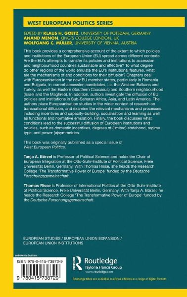 This book provides a comprehensive account of the extent to which policies and institutions of the European Union (EU) spread across different contexts covering new member states, current accession candidates, the EU's Southern and Eastern Neighbourhood as well as regional integration and cooperation in Latin America, Asia, and Africa. This book was originally published as a special issue of West European Politics.