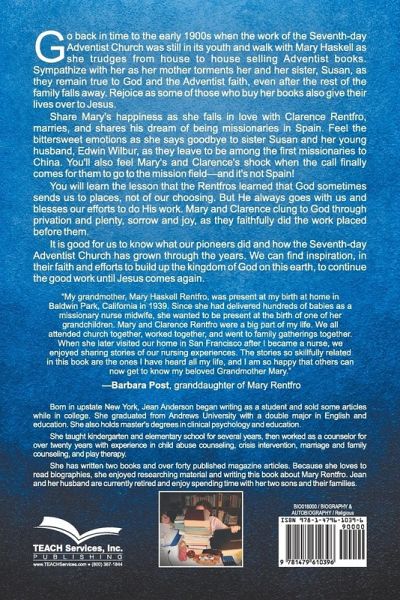 Go back in time to the early 1900s when the work of the Seventh-day Adventist Church was still in its youth and walk with Mary Haskell as she trudges from house to house selling Adventist books. Sympathize with her as her mother torments her and her sister, Susan, as they remain true to God and the Adventist faith, even after the rest of the family falls away. Rejoice as some of those who buy her books also give their lives over to Jesus. Share Mary’s happiness as she falls in love with Clarence Rentfro, marries, and shares his dream of being missionaries in Spain. Feel the bittersweet emotions as she says goodbye to sister Susan and her young husband, Edwin Wilbur, as they leave to be among the first missionaries to China. You’ll also feel Mary’s and Clarence’s shock when the call finally comes for them to go to the mission field—and it’s not Spain! You will learn the lesson that the Rentfros learned that God sometimes sends us to places, not of our choosing. But He always goes with us and blesses our efforts to do His work. Mary and Clarence clung to God through privation and plenty, sorrow and joy, as they faithfully did the work placed before them. It is good for us to know what our pioneers did and how the Seventh-day Adventist Church has grown through the years. We can find inspiration, in their faith and efforts to build up the kingdom of God on this earth, to continue the good work until Jesus comes again.
