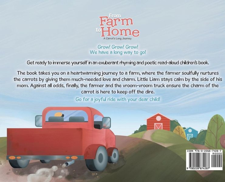 Get ready to immerse yourself in an exuberant rhyming and poetic read-aloud children's book. The book takes you on a heartwarming journey to a farm, where the farmer soulfully nurtures the carrots by giving them much-needed love and charm. Little Liam stays calm by the side of his mom. Against all odds, finally, the farmer and the vroom-vroom truck ensure the charm of the carrot is here to keep off the dire. Go for a joyful ride with your dear child!