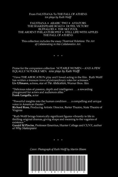 The collection includes nine full-length plays, FAUSTIANA, ARABIC TWO, AVIATORS, THE SHAKESPEARE ROAD, HOTEL VICTORY, BUFFALOES, THE SKY POOL, THE ARDENT PHILANTHROPIST, and THE FALL OF ATHENS, and one long one-act, STILL LIFE WITH APPLES. About Ruth Wolff: "I love THE ABDICATION play and I loved acting in the film. Ruth Wolff has written a treasure trove of extraordinary roles for actresses. I hope this book will find many readers." -Liv Ullmann, star of The Abdication, Warner Bros film "Ruth Wolff has written delicious roles of passion, depth and intelligence. Her commitment to the great men and women of history makes these plays a rewarding playground for actors and audiences alike." -Frank Langella "A playwright of great perception and intelligence, with powerful insights into the human condition. A compelling and unique voice in American theater." -Richard Rose, Producing Artistic Director, Barter Theater, State Theater of Virginia "Ruth Wolff brings historically significant figures vibrantly to life in thrilling original dramas, giving shape and meaning to the vagaries of existence." -Gerald M Pinciss, Professor Emeritus of English at Hunter College and CUNY, author of Why Shakespeare