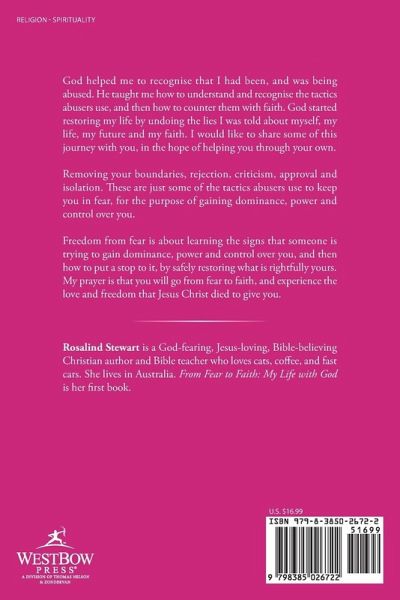 God helped me to recognise that I had been, and was being abused. He taught me how to understand and recognise the tactics abusers use, and then how to counter them with faith. God started restoring my life by undoing the lies I was told about myself, my life, my future and my faith. I would like to share some of this journey with you, in the hope of helping you through your own. Removing your boundaries, rejection, criticism, approval and isolation. These are just some of the tactics abusers use to keep you in fear, for the purpose of gaining dominance, power and control over you. Freedom from fear is about learning the signs that someone is trying to gain dominance, power and control over you, and then how to put a stop to it, by safely restoring what is rightfully yours. My prayer is that you will go from fear to faith, and experience the love and freedom that Jesus Christ died to give you.