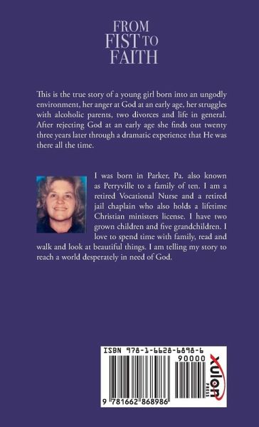 This is the true story of a young girl born into an ungodly environment, her anger at God at an early age, her struggles with alcoholic parents, two divorces and life in general. After rejecting God at an early age she finds out twenty three years later through a dramatic experience that He was there all the time. I was born in Parker, Pa. also known as Perryville to a family of ten. I am a retired Vocational Nurse and a retired jail chaplain who also holds a lifetime Christian ministers license. I have two grown children and five grandchildren. I love to spend time with family, read and walk and look at beautiful things. I am telling my story to reach a world desperately in need of God.