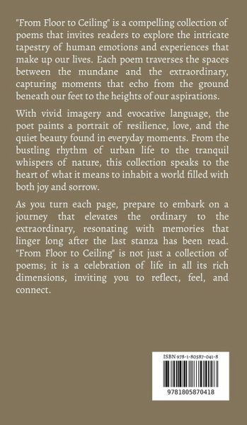 "From Floor to Ceiling" is a compelling collection of poems that invites readers to explore the intricate tapestry of human emotions and experiences that make up our lives. Each poem traverses the spaces between the mundane and the extraordinary, capturing moments that echo from the ground beneath our feet to the heights of our aspirations. With vivid imagery and evocative language, the poet paints a portrait of resilience, love, and the quiet beauty found in everyday moments. From the bustling rhythm of urban life to the tranquil whispers of nature, this collection speaks to the heart of what it means to inhabit a world filled with both joy and sorrow. As you turn each page, prepare to embark on a journey that elevates the ordinary to the extraordinary, resonating with memories that linger long after the last stanza has been read. "From Floor to Ceiling" is not just a collection of poems; it is a celebration of life in all its rich dimensions, inviting you to reflect, feel, and connect.