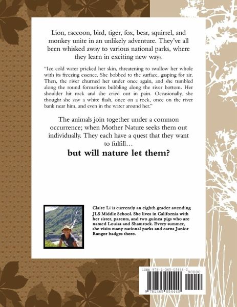 Lion, raccoon, bird, tiger, fox, bear, squirrel, and monkey unite in an unlikely adventure. They've all been whisked away to various national parks, where they learn in exciting new ways. "Ice cold water pricked her skin, threatening to swallow her whole with its freezing essence. She bobbed to the surface, gasping for air. Then, the river churned her under once again, and she tumbled along the round formations bubbling along the river bottom. Her shoulder hit rock and she cried out in pain. Occasionally, she thought she saw a white flash, once on a rock, once on the river bank near him, and even in the water around her." The animals join together under a common occurrence; when Mother Nature seeks them out individually. They each have a quest that they want to fulfill... but will nature let them?