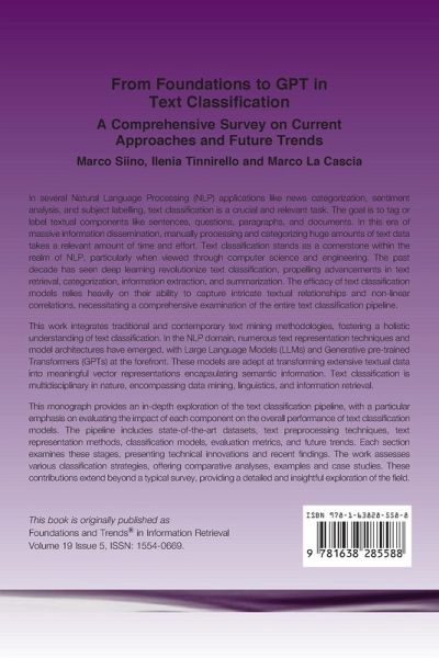 In several Natural Language Processing (NLP) applications like news categorization, sentiment analysis, and subject labelling, text classification is a crucial and relevant task. The goal is to tag or label textual components like sentences, questions, paragraphs, and documents. In this era of massive information dissemination, manually processing and categorizing huge amounts of text data takes a relevant amount of time and effort. Text classification stands as a cornerstone within the realm of NLP, particularly when viewed through computer science and engineering. The past decade has seen deep learning revolutionize text classification, propelling advancements in text retrieval, categorization, information extraction, and summarization. The efficacy of text classification models relies heavily on their ability to capture intricate textual relationships and non-linear correlations, necessitating a comprehensive examination of the entire text classification pipeline.This work integrates traditional and contemporary text mining methodologies, fostering a holistic understanding of text classification. In the NLP domain, numerous text representation techniques and model architectures have emerged, with Large Language Models (LLMs) and Generative pre-trained Transformers (GPTs) at the forefront. These models are adept at transforming extensive textual data into meaningful vector representations encapsulating semantic information. Text classification is multidisciplinary in nature, encompassing data mining, linguistics, and information retrieval. This monograph provides an in-depth exploration of the text classification pipeline, with a particular emphasis on evaluating the impact of each component on the overall performance of text classification models. The pipeline includes state-of-the-art datasets, text preprocessing techniques, text representation methods, classification models, evaluation metrics, and future trends. Each section examines these stages, presenting technical innovations and recent findings. The work assesses various classification strategies, offering comparative analyses, examples and case studies. These contributions extend beyond a typical survey, providing a detailed and insightful exploration of the field.
