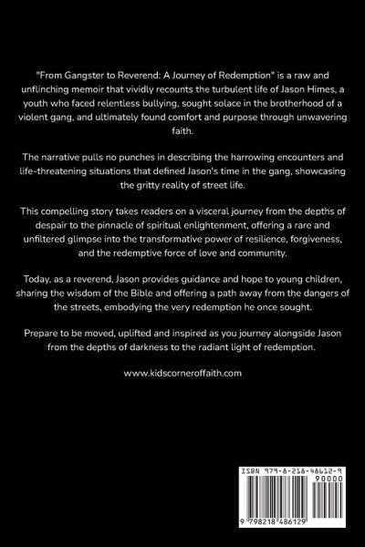 "From Gangster to Reverend: A Journey of Redemption" is a raw and unflinching memoir that vividly recounts the turbulent life of Jason Himes, a youth who faced relentless bullying, sought solace in the brotherhood of a violent gang, and ultimately found comfort and purpose through unwavering faith. The narrative pulls no punches in describing the harrowing encounters and life-threatening situations that defined Jason's time in the gang, showcasing the gritty reality of street life. This compelling story takes readers on a visceral journey from the depths of despair to the pinnacle of spiritual enlightenment, offering a rare and unfiltered glimpse into the transformative power of resilience, forgiveness, and the redemptive force of love and community. Today, as a reverend, Jason provides guidance and hope to young children, sharing the wisdom of the Bible and offering a path away from the dangers of the streets, embodying the very redemption he once sought. Prepare to be moved, uplifted and inspired as you journey alongside Jason from the depths of darkness to the radiant light of redemption.