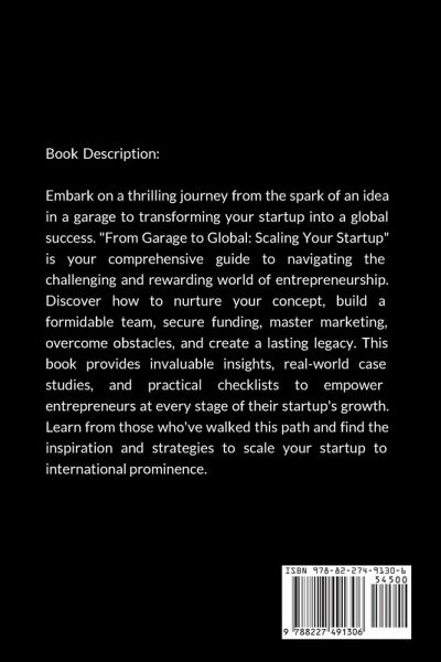 Book Description: Embark on a thrilling journey from the spark of an idea in a garage to transforming your startup into a global success. "From Garage to Global: Scaling Your Startup" is your comprehensive guide to navigating the challenging and rewarding world of entrepreneurship. Discover how to nurture your concept, build a formidable team, secure funding, master marketing, overcome obstacles, and create a lasting legacy. This book provides invaluable insights, real-world case studies, and practical checklists to empower entrepreneurs at every stage of their startup's growth. Learn from those who've walked this path and find the inspiration and strategies to scale your startup to international prominence.