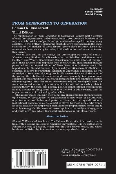 The republication of From Generation to Generation-almost half a century after its first appearance in 1956-constitutes a good occasion for a look at the way in which problems of youth and generations developed in contemporary societies. In this brilliant, pioneering effort, different approaches in the social sciences to the analysis of these issues receive close scrutiny. Eisenstadt reexamines these issues by including in this edition several new chapters on this theme.