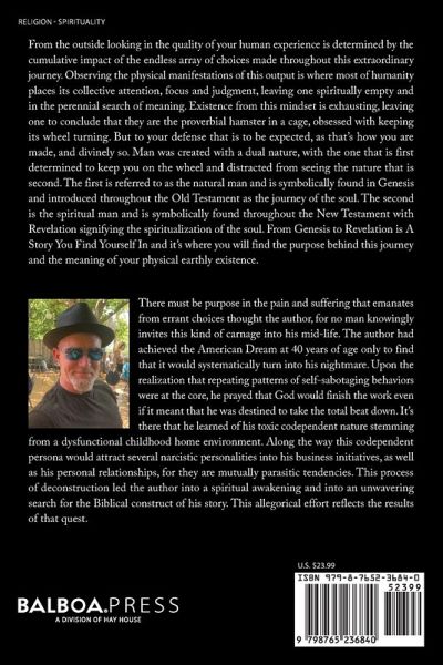 From Genesis to Revelation: A Story You Find Yourself In is a book about the journey of the soul and how it's reflected in the esoteric Bible. The book is written as an allegory by animating characters found in the creation and together serve as our hosts during this earthly sojourn. It's through the unbiased observations made by these characters that we come to better understand ourselves and the purpose of this incarnation. The quality of our relationship with the creation and with other human's is solely dependent upon the quality of the relationship that we have with our inner man. Becoming aware of awareness is the beginning of this understanding and is perfected through the process of internal observation. The book recognizes that humanity is stressing the creations integrity and its ability to maintain a proper ecosystem in support of our human experience. In response, the creation determines that something must be done, concluding that acquiring a thorough understanding the nature of man's inner and collective psyche as the first order of business. In this process of discovery, the creation explores the contrasts between the practices of religion and the pursuits of spirituality, while endeavoring to correlate its findings with the symbolisms found in the Bible. What they discover is a revelatory paradox, as their findings suggest that these human practices and pursuits do not align with the spiritual meaning hidden in these sacred texts. The journey of humanity is a story you find yourself in and the only way forward is for each of us to come into a reconciliation with our dual natures. I hope this book can help in that cause as the answers are found within, from Genesis to Revelation.
