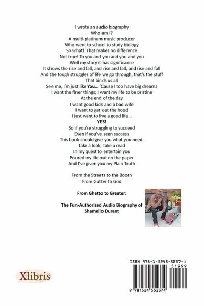 I wrote an audio biography. Who am I? A multiplatinum music producer Who went to school to study biology. So what! That makes no difference. Not true! To you and you and you and you, Well, my story it has significance. It shows the rise and fall, and rise and fall, and rise and fall And the tough struggles of life we go through, that’s the stuff That binds us all. See me, I’m just like you . . . ’cause I too have big dreams. I want the finer things; I want my life to be pristine. At the end of the day, I want good kids and a bad wife. I want to get out of the hood. I just want to live a good life, Yes! So if you’re struggling to succeed, Even if you’ve seen success, This book should give you what you need. Take a look; take a read. In my quest to entertain you Poured my life out on the paper. And I’ve given you my plain truth From the streets to the booth From gutter to God From ghetto to greater. The Fun-Authorized Audio Biography of Shamello Durant