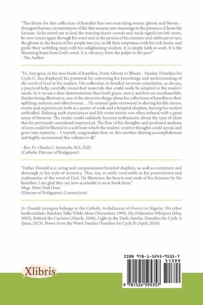The theme for this collection of homilies has two overriding words: gloom and bloom-divergent human circumstances of life that assume new meanings in the presence of Jesus the Savior. As he stood out to feed the teeming desert crowds and made significant leftovers, he now comes again through his Word and in the person of his minister and celebrant to turn the gloom in the hearts of his people into joy, to fill their emptiness with his rich food, and to guide their wobbling steps with his enlightening wisdom. It is simply faith at work. It is the blooming hope from God's Word. It is vibrancy from the pulpit to the pew!