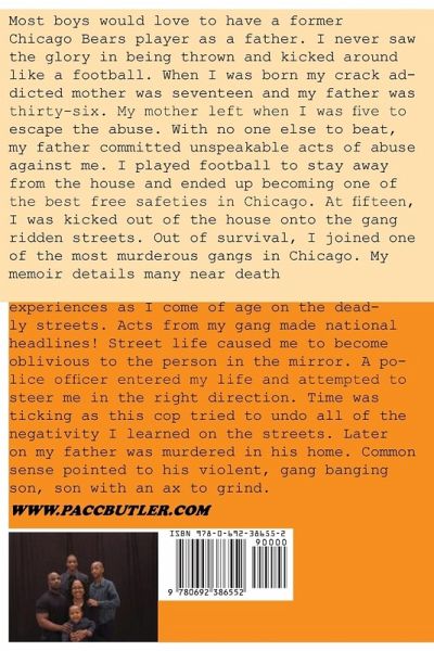 Most boys would love to have a former Chicago Bear player as a father. For me, it wasn't glamorous being thrown and kicked around like a football. He wasn't my hero. He was a monster. When he tossed me out, I became just like him. When I was born my crack addicted mother was seventeen. My father was thirty-six, and married to another woman. My father divorced his wife and kids to pursue a relationship with my mother. My mother escaped the abuse by leaving us when I was six. With no one else to abuse, my father committed unspeakable acts of violence against me. I was athletically gifted. I played sports to stay away from my abusive home. I ended up becoming one of the best football players in Chicago, but it was not enough to keep me out of the life of crime. At sixteen, I was put out on the gang ridden streets. Gang life seemed to be the only way for a homeless kid to survive. I ended up joining one of the most murderous gangs in Chicago. My memoir details many near death experiences as I come of age on the deadly streets of Chicago. The tumultuous gang life caused me to become oblivious to the person in the mirror. One violent act committed by my gang made national headlines. A retired Chicago policeman entered my life and attempted to steer me in the right direction. Time was ticking as this cop tried to undo all the negativity that I had acquired on the streets. Later, my father was murdered in his home! Common sense pointed to his violent, gang banging son, with an axe to grind.