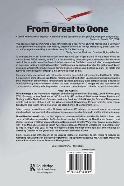 To compete for the modern consumer it is critical to move from being an old-fashioned FMCG to being an FICG - a fast-innovating consumer goods company - but there are major internal and external hurdles to this transformation. Outdated communication strategies based on television, radio and print with constant repetition must be replaced by what the authors call 'Lego' strategies, whereby the marketing and communication strategies are built up by many key facets and delivered to the consumer through a mix of various touch points. From Great to Gone points out what the winners of the 21st century have in common that has enabled them to achieve this transformation.