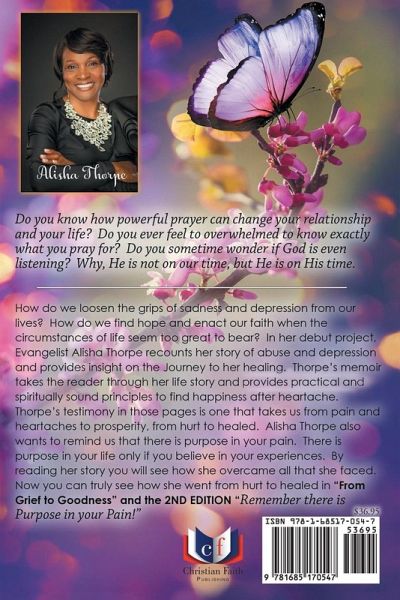 How do we loosen the grips of sadness and depression from our lives? How do we find hope and enact our faith when the circumstances of life seem too great to bear? In her debut project, Evangelist Alisha Thorpe recounts her story of abuse and depression and provides insight on the journey to her healing. Thorpe's memoir takes the reader through her life story and provides practical and spiritually sound principles to find happiness after heartache. Thorpe's testimony in those pages is one that takes us from pain and heartache to prosperity, from hurt to healed. Alisha Thorpe also wants to remind us that there is purpose in your pain. There is purpose in your life only if you believe in your experiences. By reading her story, you will see how she overcame all that she faced. Now you can truly see how she went from hurt to healed in From Grief to Goodness and the second edition Remember There Is Purpose in Your Pain! Do you know how powerful prayer can change your relationship and your life? Do you ever feel too overwhelmed to know exactly what to pray for? Do you sometimes wonder if God is even listening? Why, He is not on our time, but He is on His time.