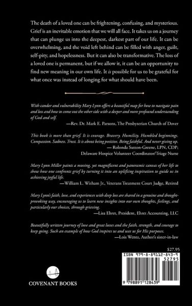 The death of a loved one can be frightening, confusing, and mysterious. Grief is an inevitable emotion that we will all face. It takes us on a journey that can plunge us into the deepest, darkest part of our life. It can be overwhelming, and the void left behind can be filled with anger, guilt, self-pity, and hopelessness. But it can also be transformative. The loss of a loved one is permanent, but if we allow it, it can be an opportunity to find new meaning in our own life. It is possible for us to be grateful for what once was instead of longing for what should have been. ___________________________________________________________ With candor and vulnerability Mary Lynn offers a beautiful map for how to navigate pain and loss and how to come out the other side with a deeper and more profound understanding of God and self. --Rev. Dr. Mark E. Parsons, The Presbyterian Church of Dover This book is more than grief. It is courage. Bravery. Humility. Humbled beginnings. Compassion. Sadness. Trust. It is about being positive. Being faithful. And never giving up. -- Rolonda Sutton-Greene, LPN, CDP; Delaware Hospice Volunteer Coordinator/Triage Nurse Mary Lynn Miller paints a moving, yet magnificent and panoramic canvas of her life to show how one confronts grief by turning it into an uplifting inspiration to guide us in achieving joyful life. --William L. Witham Jr., Veterans Treatment Court Judge, Retired Mary Lynn's faith, love, and experiences with deep loss are shared in a genuine and thought- provoking way, encouraging us to learn new insights into our own thoughts, feelings, and particularly our choices, through grieving. --Lisa Ehret, President, Ehret Accounting, LLC Beautifully written journey of love and great losses and the faith, strength, and courage to keep going. Such an example of how God inspires us and uses us for His purposes. --Lois Wentz, Author's sister-in-law