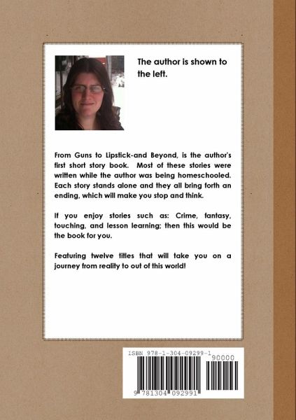 From Guns to Lipstick-and Beyond, is the author's first short story book. Most of these stories were written while the author was being homeschooled. Each story stands alone and they all bring forth an ending, which will make you stop and think. If you enjoy stories such as: Crime, fantasy, touching, and lesson learning; then this would be the book for you. Featuring twelve titles that will take you on a journey from reality to out of this world!