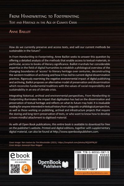 How do we currently preserve and access texts, and will our current methods be sustainable in the future? In From Handwriting to Footprinting, Anne Baillot seeks to answer this question by offering a detailed analysis of the methods that enable access to textual materials, in particular, access to books of literary significance. Baillot marshals her considerable expertise in the field of digital humanities to establish a philological overview of the changing boundaries of 'access' to literary heritage over centuries, deconstructing the western tradition of archiving and how it has led to current digital dissemination practices. Rigorously examining the negative environmental impact of digital publishing and archiving, Baillot proposes an alternative model of preservation and dissemination which reconciles fundamental traditions with the values of social responsibility and sustainability in an era of climate crisis. Integrating historical, archival and environmental perspectives, From Handwriting to Footprinting illuminates the impact that digitisation has had on the dissemination and preservation of textual heritage and reflects on what its future may hold. It is invaluable reading for anyone interested in textual history from a linguistic or philological perspective, as well as those working on publishing, archival and infrastructure projects that require the storing and long-term preservation of texts, or who want to know how to develop a more mindful attachment to digitised material.