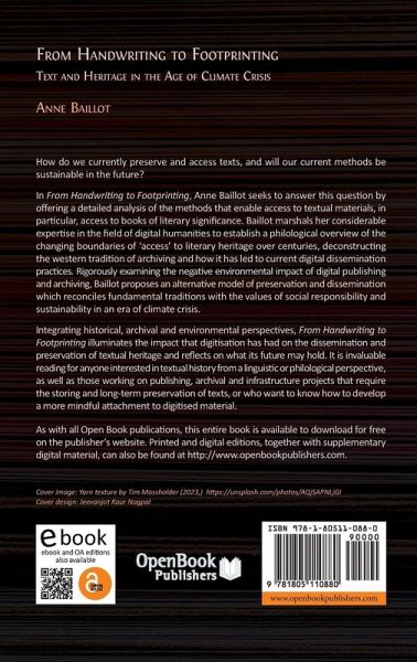 How do we currently preserve and access texts, and will our current methods be sustainable in the future? In From Handwriting to Footprinting, Anne Baillot seeks to answer this question by offering a detailed analysis of the methods that enable access to textual materials, in particular, access to books of literary significance. Baillot marshals her considerable expertise in the field of digital humanities to establish a philological overview of the changing boundaries of 'access' to literary heritage over centuries, deconstructing the western tradition of archiving and how it has led to current digital dissemination practices. Rigorously examining the negative environmental impact of digital publishing and archiving, Baillot proposes an alternative model of preservation and dissemination which reconciles fundamental traditions with the values of social responsibility and sustainability in an era of climate crisis. Integrating historical, archival and environmental perspectives, From Handwriting to Footprinting illuminates the impact that digitisation has had on the dissemination and preservation of textual heritage and reflects on what its future may hold. It is invaluable reading for anyone interested in textual history from a linguistic or philological perspective, as well as those working on publishing, archival and infrastructure projects that require the storing and long-term preservation of texts, or who want to know how to develop a more mindful attachment to digitised material.