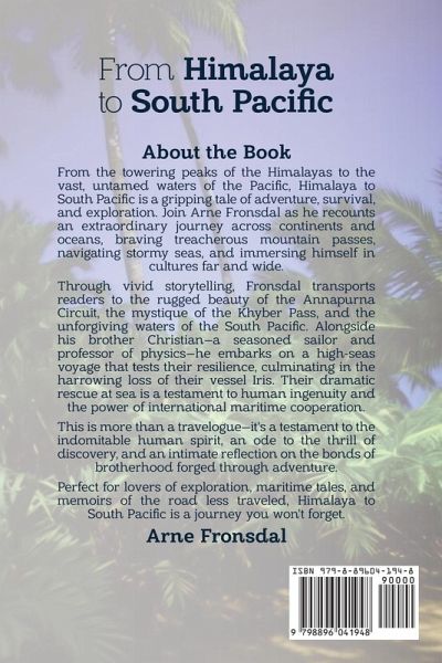From Himalaya to South Pacific is an inspiring memoir of adventure, resilience, and exploration. Arne Fronsdal shares his extraordinary journey across continents-from crossing the Atlantic on a freighter to navigating the towering Himalayas, the rugged Andes, and the vast Pacific. More than a travelogue, this book is a testament to the thrill of discovery, the power of human spirit, and the deep connection between man and nature. Perfect for lovers of exploration, maritime tales, and true adventure stories.