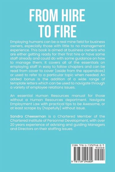 Employing humans can be a real mine field for business owners, especially those with little to no management experience. This book is aimed at business owners who are either getting ready for their first hire or have some staff already and could do with some guidance on how to manage them. It covers all of the essentials on employing staff in easy to follow chapters and can be read from cover to cover (aside from the appendices) or used to refer to a particular topic when needed. An added bonus is the addition of a wide range of template letters which can be used to navigate through a variety of employee relations issues. An essential Human Resources manual for those without a Human Resources department. Navigate Employment Law with practical tips to be Awesome, or at least scrape by (hopefully) without issue. ¿Sandra Cheeseman is a Chartered Member of the Chartered Institute of Personnel Development, with over 20 years experience of advising and guiding Managers and Directors on their staffing issues.