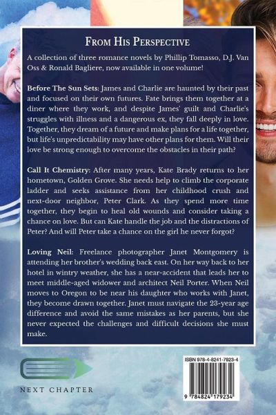 A collection of three romance novels by Phillip Tomasso, D.J. Van Oss & Ronald Bagliere, now available in one volume! Before The Sun Sets: James and Charlie are haunted by their past and focused on their own futures. Fate brings them together at a diner where they work, and despite James' guilt and Charlie's struggles with illness and a dangerous ex, they fall deeply in love. Together, they dream of a future and make plans for a life together, but life's unpredictability may have other plans for them. Will their love be strong enough to overcome the obstacles in their path? Call It Chemistry: After many years, Kate Brady returns to her hometown, Golden Grove. She needs help to climb the corporate ladder and seeks assistance from her childhood crush and next-door neighbor, Peter Clark. As they spend more time together, they begin to heal old wounds and consider taking a chance on love. But can Kate handle the job and the distractions of Peter? And will Peter take a chance on the girl he never forgot? Loving Neil: Freelance photographer Janet Montgomery is attending her brother's wedding back east. On her way back to her hotel in wintry weather, she has a near-accident that leads her to meet middle-aged widower and architect Neil Porter. When Neil moves to Oregon to be near his daughter who works with Janet, they become drawn together. Janet must navigate the 23-year age difference and avoid the same mistakes as her parents, but she never expected the challenges and difficult decisions she must make.