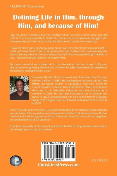 Defining Life in Him, through Him, and because of Him! Have you been in denial about your lifestyle? If so, it's time to come clean and get real! In From Homosexuality to Christ, the author shares his personal struggles with homosexuality and how he reconciled his lifestyle with the church's teachings. I never felt like it was wrong because as far as I can remember it felt normal and right-until I met Jesus Christ. The Lord showed me through His Word that homosexuality was just sin like any other sin. He also showed me that I could change through the help of God. I learned that God loves me no matter what. God loves mankind and created all in the likeness of His own image. Let's stop destroying-through bias, judgment, and criticism- what He has created, and experience the profound love God has for us all.