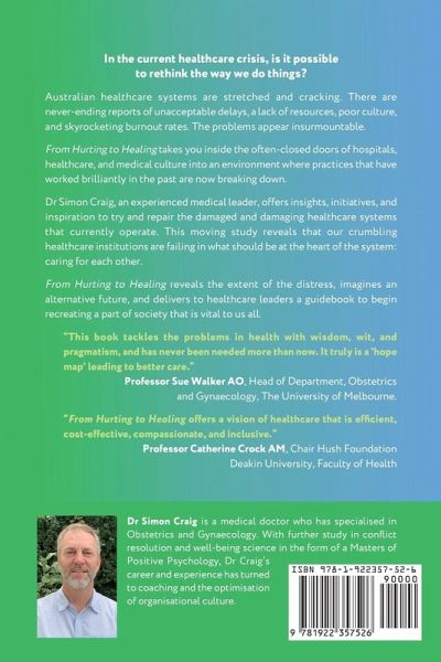 In the current healthcare crisis, is it possible to rethink the way we do things? Australian healthcare systems are stretched and cracking. There are never-ending reports of unacceptable delays, a lack of resources, poor culture, and skyrocketing burnout rates. The problems are overwhelming and appear insurmountable. From Hurting to Healing takes you inside the often-closed doors of hospitals, healthcare, and medical culture into an environment where practices that have worked brilliantly in the past are now breaking down. Dr Simon Craig, an experienced medical leader, offers insights, initiatives, and inspiration to try and repair the damaged and damaging healthcare systems that currently exist. This moving study reveals that our crumbling healthcare institutions are failing in what should be at the heart of healthcare: caring for each other. Dr Craig outlines his vision of a new way; A kinder and more humanistic approach that can help transform the devastation that exists in health today. From Hurting to Healing reveals the extent of the distress, imagines an alternative future, and delivers to healthcare leaders a guidebook to begin recreating a part of society that is vital to us all.