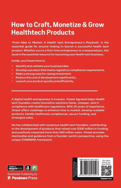 "From Idea to Market: A Health tech Entrepreneur's Playbook" is the essential guide for anyone looking to launch a successful health tech product. Whether you're a first-time entrepreneur or a seasoned pro, this book is the essential resource for launching your Health tech business. Inside, you'll learn how to: ¿ Identify and validate your business idea. ¿ Develop a product that meets regulatory compliance requirements. ¿ Make a strong case for raising investment. ¿ Reduce the cost of development significantly. ¿ Launch your product quickly and efficiently. "A digital health entrepreneur & investor, Vineet Agrawal helps Health tech founders create innovative solutions faster, cheaper, and in compliance with healthcare regulations. With 25 years of experience, Vineet offers roadmaps to enhance time to market, develop scalable products, handle healthcare compliances, secure funding, and strategize sales. He has collaborated with numerous health tech founders, contributing to the development of products that raised over $300 million in funding and positively impacted more than 500 million users. Vineet provides mentorship and guidance from a founder-centric perspective, using the unique CHARISMA framework."