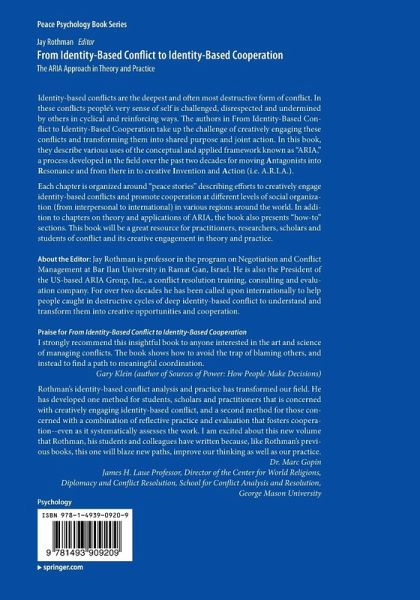 Conflict and Identity.- ARIA Contingency Model.- To Thine Own Self Be True -The Solo.- I and Thou- Duets.- Conducting (a): Intragroup Conflict.-Conducting (b): Intergroup negotiation and consensus building.- Sustaining the Change.- Experimenting with ARIA globally.- Engaging Identities in Conflict: Some Methodological Insights and Dilemmas.- Conflict and Visioning in Urban Violence and Peacemaking.- Converting Antagonism in to Resonance - Research and Training.- Viewing Identity Conflict through the Lens of Developmental Psychology.- Building Local Capacity in Identity-Based Conflict.- Spiritual Roots of the Four Worlds, and Healing the Enlightenment Rift for Conflict Transformation.- Applications and new directions of Creative Identity-Based Conflict Engagement.