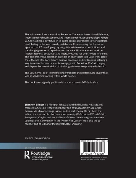 This volume explores the work of Robert W. Cox across International Relations, International Political Economy, and International Historical Sociology. Robert W. Cox has been a key figure in so-called critical approaches to world politics, contributing to the inter-paradigm debate in IR, pioneering the Gramscian approach to IPE, developing key insights into international institutions, and the changing nature of capitalism and the state. His more recent work on intercivilizational encounters and intersubjectivity has been no less influential. This comprehensive collection provides an entry-point into Cox's work across these themes of history, theory, political economy, and civilizations, offering a way for researchers and students to engage with Robert W. Cox's rich legacy and deploy the many insights of his thought into contemporary scholarship.This book will be of interest to undergraduate and postgraduate students as well as academics working within world politics. This book was originally published as a special issue of the journal Globalizations.