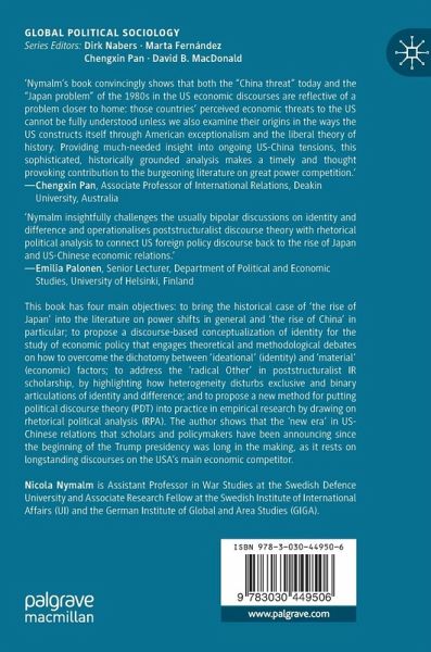 This book has four main objectives: to bring the thus far almost entirely neglected historical case of 'the rise of Japan' into the literature on power shifts in general and 'the rise of China' in particular; to propose a discourse-based conceptualization of identity for the study of economic policy that engages theoretical and methodological debates on how to overcome the dichotomy between 'ideational' (identity) and 'material' (economic) factors; to address the tendency to focus on the 'radical Other' in poststructuralist IR scholarship, by highlighting how heterogeneity disturbs exclusive and binary articulations of identity and difference; and to propose a method for putting political discourse theory (PDT) into practice in empirical research by drawing on rhetorical political analysis (RPA). US congressional debates on economic policy on Japan and China in 1985-2008 are analysed as examples of official US elite public discourse. The book shows that the 'new era' in US-Chinese relations that scholars and policymakers have been announcing since the beginning of the Trump presidency was long in the making, as it rests on longstanding discourses on the USA's main economic competitor.